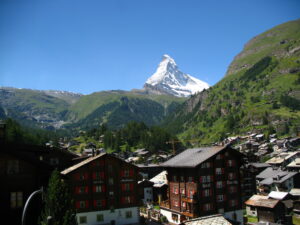Zermatt is a municipality in the district of Visp in the German-speaking section of the canton of Valais in Switzerland. It lies at the upper end of Mattertal at an elevation of 1,620m, at the foot of Switzerland’s highest peaks.